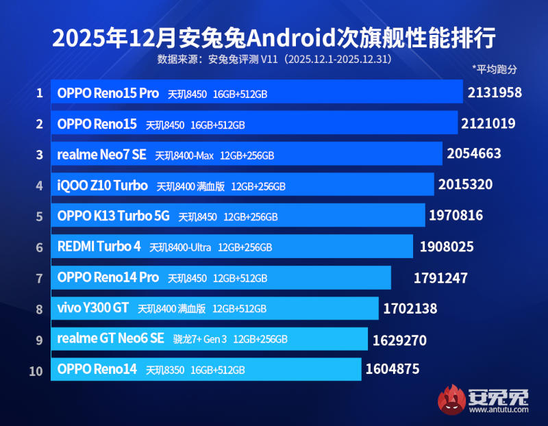 Как и в ноябрьском рейтинге, значительную долю топа смартфонов верхнего среднего ценового сегмента заняли устройства на процессорах MediaTek. Первое и второе места достались моделям Oppo Reno15 Pro (2 131 958) и Reno15 (2 121 019) — оба на чипе Dimensity 8450. Третьим стал Realme Neo7 SE (Dimensity 8400-Max, 2 054 663), четвёртым — iQOO Z10 Turbo (Dimensity 8400, 2 015 320), пятым — Oppo K13 Turbo (Dimensity 8450, 1 970 816). Далее следуют Redmi Turbo 4 (Dimensity 8400-Ultra, 1 908 025), Oppo Reno14 Pro (Dimensity 8450, 1 791 247), Vivo Y300 GT (Dimensity 8400, 1 702 138), Realme GT Neo6 SE (Qualcomm Snapdragon 7 Gen 3, 1 629 270) и Oppo Reno14 (Dimensity 8350, 1 604 875).