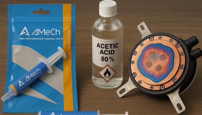 Ресурс Igor`s LAB опубликовал информацию о неожиданных свойствах, которые продемонстрировала термопаста AMECH SGT-4. Сообщается, что в Сети появляется всё больше отзывов пользователей из Южной Кореи, которые свидетельствуют о видимых коррозионных повреждениях медных оснований кулеров и выделении вредных веществ с неприятным «уксусным» запахом. Производитель не предоставил объективных данных, ограничившись «необъективными и личными нападками».