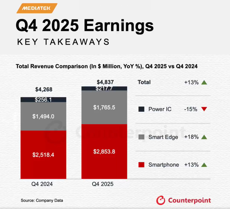 На сегмент мобильных процессоров приходится 59 % от общей квартальной выручки MediaTek. Однако компания может столкнуться с некоторыми трудностями в будущем, поскольку предыдущие прогнозы указывали на снижение поставок чипов для смартфонов в 2026 году из-за роста цен на DRAM и NAND-флеш-память. Как прогнозируется, компания всё равно сохранит лидирующие позиции в этом году по сравнению со своими конкурентами.