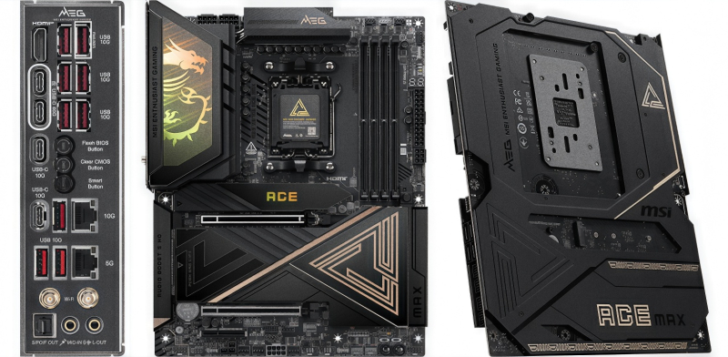 Среди представленных плат модель MEG X870E Ace MAX является флагманской и предназначена в первую очередь для энтузиастов. Новинка оснащена очень мощной 21-фазной подсистемой питания VRM (схема 18+2+1). Производитель сделал акцент на большие возможности платы в разгоне различных комплектующих. Плата предлагает четыре порта USB-C (два 10 Гбит/с и два 40 Гбит/с), оснащена 5- и 10-Гбит/с сетевыми контроллерами, а также множеством портов USB Type-A, несколькими слотами M.2 для SSD PCIe 5.0 и PCIe 4.0.