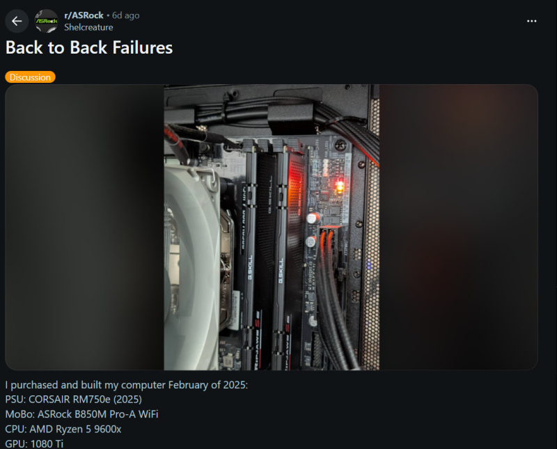 Один из пользователей описывает два последовательных сбоя Ryzen 5 9600X на одной и той же платформе (плата ASRock B850M Pro-A WiFi). Первый случай произошёл в октябре прошлого года. Пользователь заменил процессор по гарантии, однако второй чип также вышел из строя.