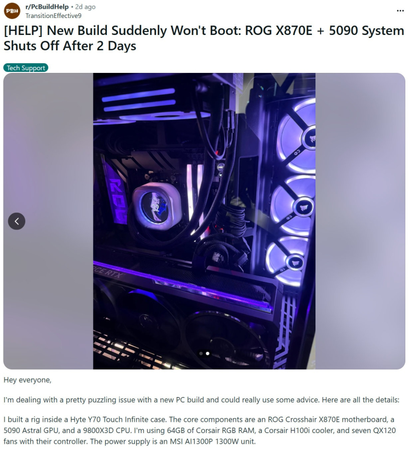 • Материнская плата ROG Crosshair X870E Hero. Система зависла в процессе игровой сессии, после чего появился чёрный экран с ошибкой. Автор отмечает, что проблему решила замена процессора и он продолжает выяснять причины сбоя с поддержкой AMD.