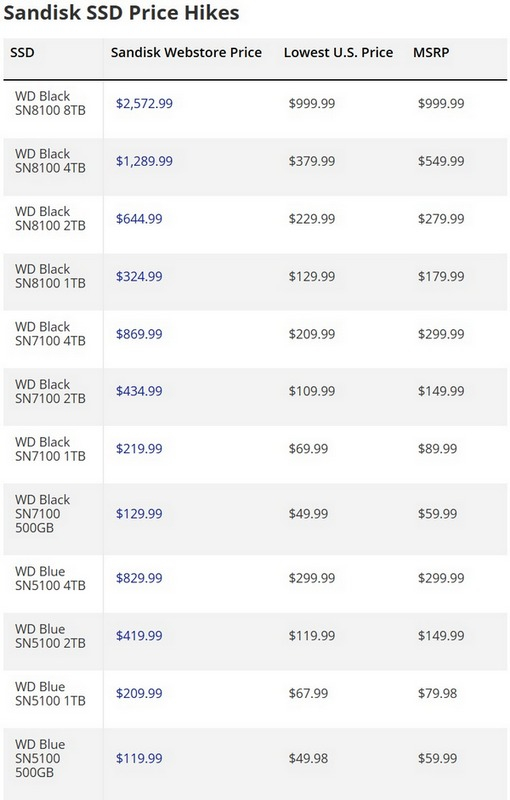 В частности, флагманский твердотельный накопитель Sandisk WD Black SN8100 в прошлом месяце оказался в 2,5 раза дороже того уровня, на который компания предлагала ориентироваться ещё не так давно. Модель объёмом 8 Тбайт, например, предлагается по цене более $2500. В фирменном интернет-магазине Sandisk в США цены на SSD с начала года выросли в 2,5 или 3 раза по широкому ассортименту моделей WD Black и Blue.