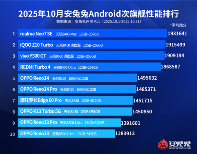 Лидером рейтинга среднебюджетных смартфонов стал Realme Neo7 SE с процессором MediaTek Dimensity 8400-Ultra и внушительным средним баллом 1 931 641. Второе и третье места достались iQOO Z10 Turbo и Vivo Y300 GT, которые набрали 1 915 499 и 1 909 184 балла соответственно — оба смартфона работают на Dimensity 8400. Четвёртым стал Redmi Turbo 4 снова на Dimensity 8400-Ultra с результатом 1 868 587 баллов. Пятым и шестым стали Oppo Reno 14 и Reno 14 Pro на чипах Dimensity 8350 и 8450 — они показали соответственно 1 495 632 и 1 485 371 балл. Motorola Edge 60 Pro на Dimensity 8350 стал седьмым с 1 451 715 баллами; Oppo K13 Turbo 5G на Dimensity 8450 — восьмым с 1 450 850 баллами. Девятое и десятое места с чипом Dimensity 8400-Ultra досталось смартфонам Oppo Reno 13 Pro и Reno 13 с результатами 1 291 601 и 1 283 913 баллов соответственно.