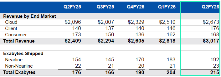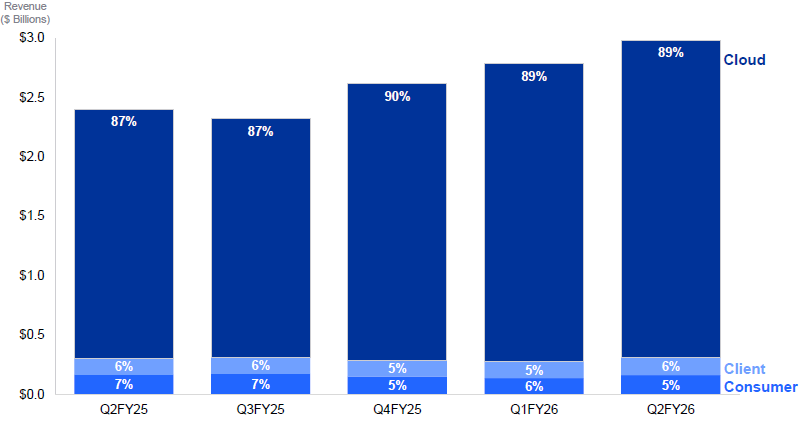 В облачном сегменте выручка Western Digital в прошлом квартале составила $2,67 млрд, что соответствует 89 % всей выручки компании. На долю клиентских решений пришлось только 6 % выручки ($176 млн), в сегменте накопителей для потребительской электроники были выручены оставшиеся 5 % ($168 млн).