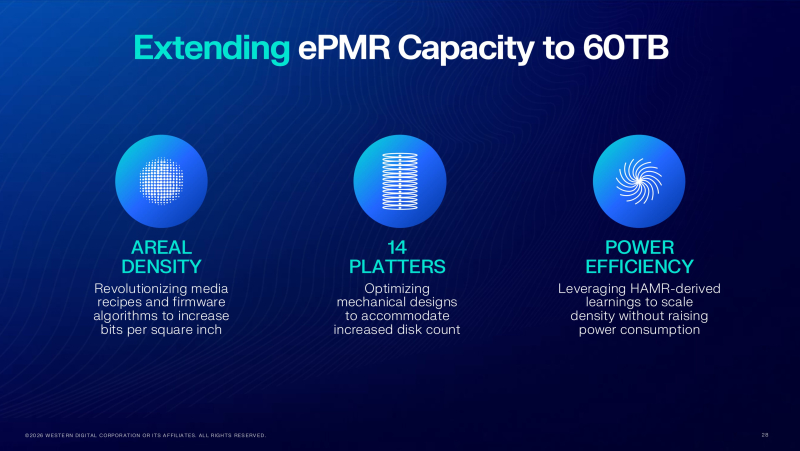 В рамках презентации для инвесторов Innovation Day компания Western Digital раскрыла свои планы. Компания рассказала, когда стоит ждать первые 40-Тбайт жёсткие диски на базе технологии HAMR, и поведала, что в её лабораториях уже заложен фундамент для дисков на 100 Тбайт и более. Одновременно ожидается, что модели с технологией ePMR достигнут ёмкости 60 Тбайт. Кроме того, в ближайшее время планируется внедрение моделей, в которых будет использоваться 14 пластин.