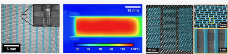Синим обозначен 3D-печатный заживляющий пластик, на правом изображении видны углеродные нагреватели. Источник изображения: NC State University